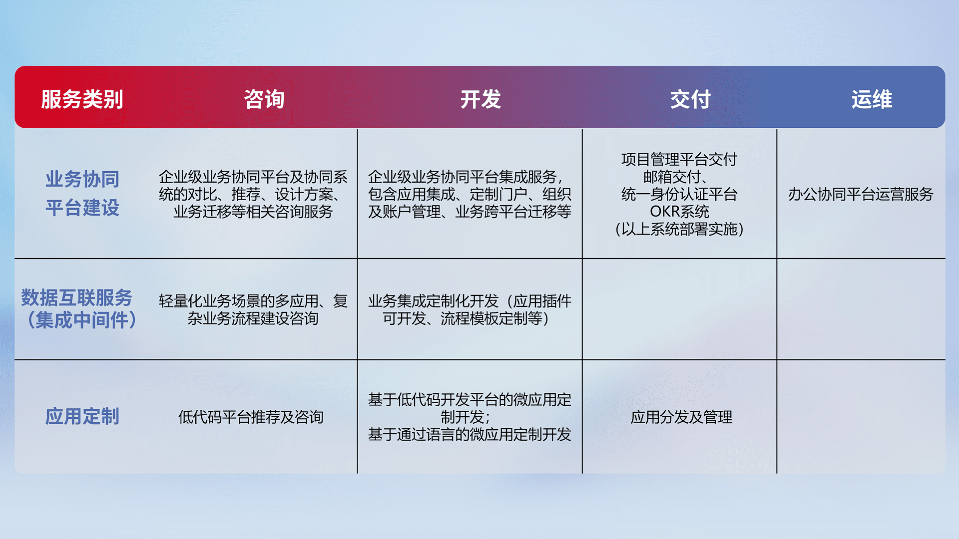 针对钉钉、、、、企微、、、、IDaas等平台级产品提供产品的规划、、方案、、、、交付、、定制化开发等服务,,,,实现如统一协同办公、、、智能客户服务、、、、混合会议管理、、、、智能数据查询、、、等业务场景,,,实现数字化转型。。。。